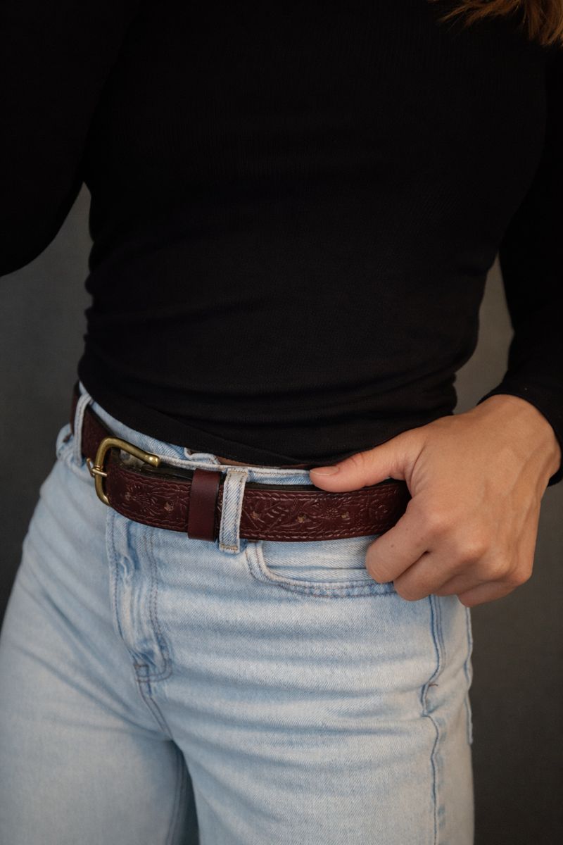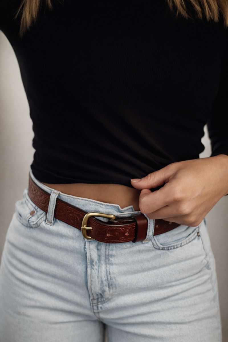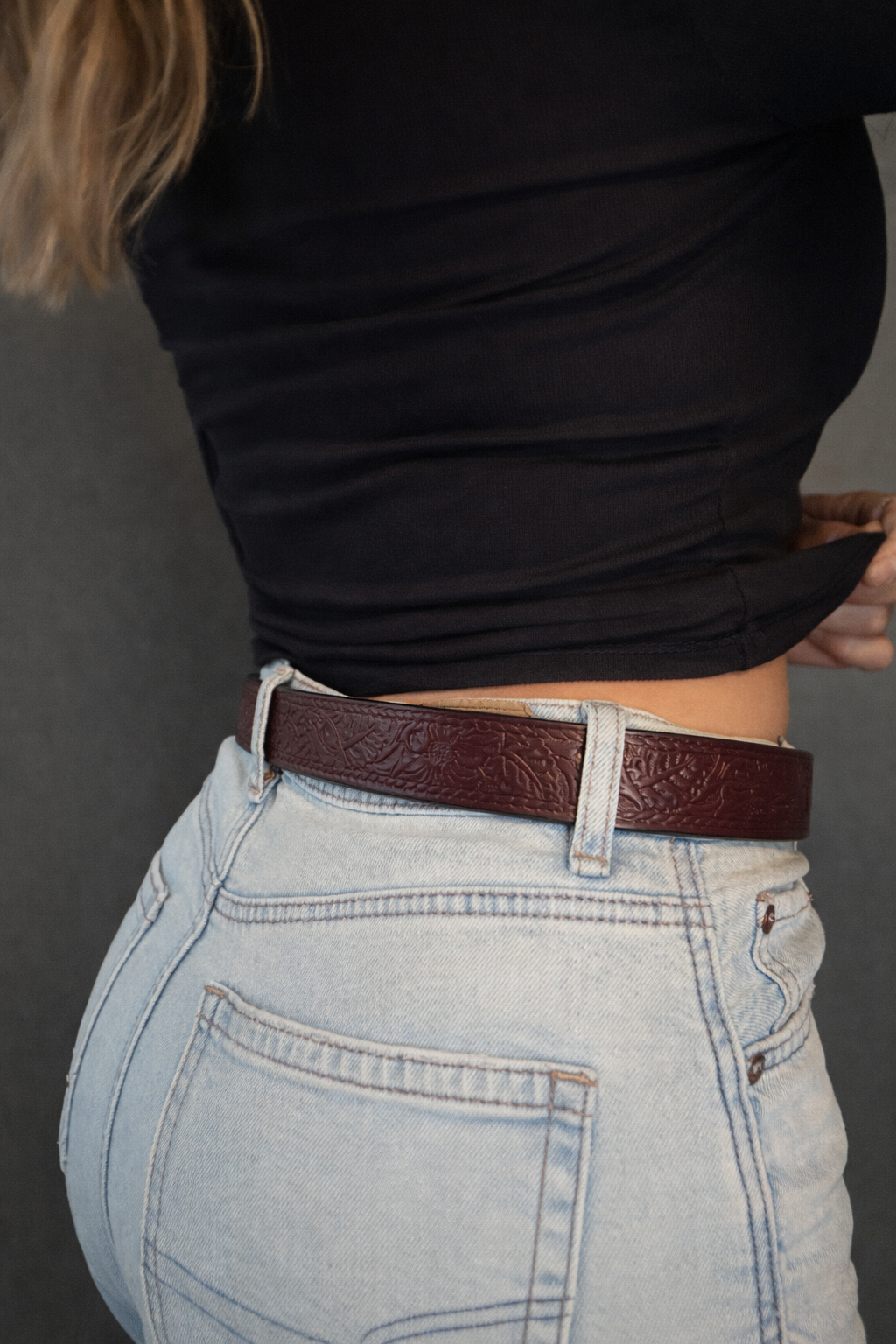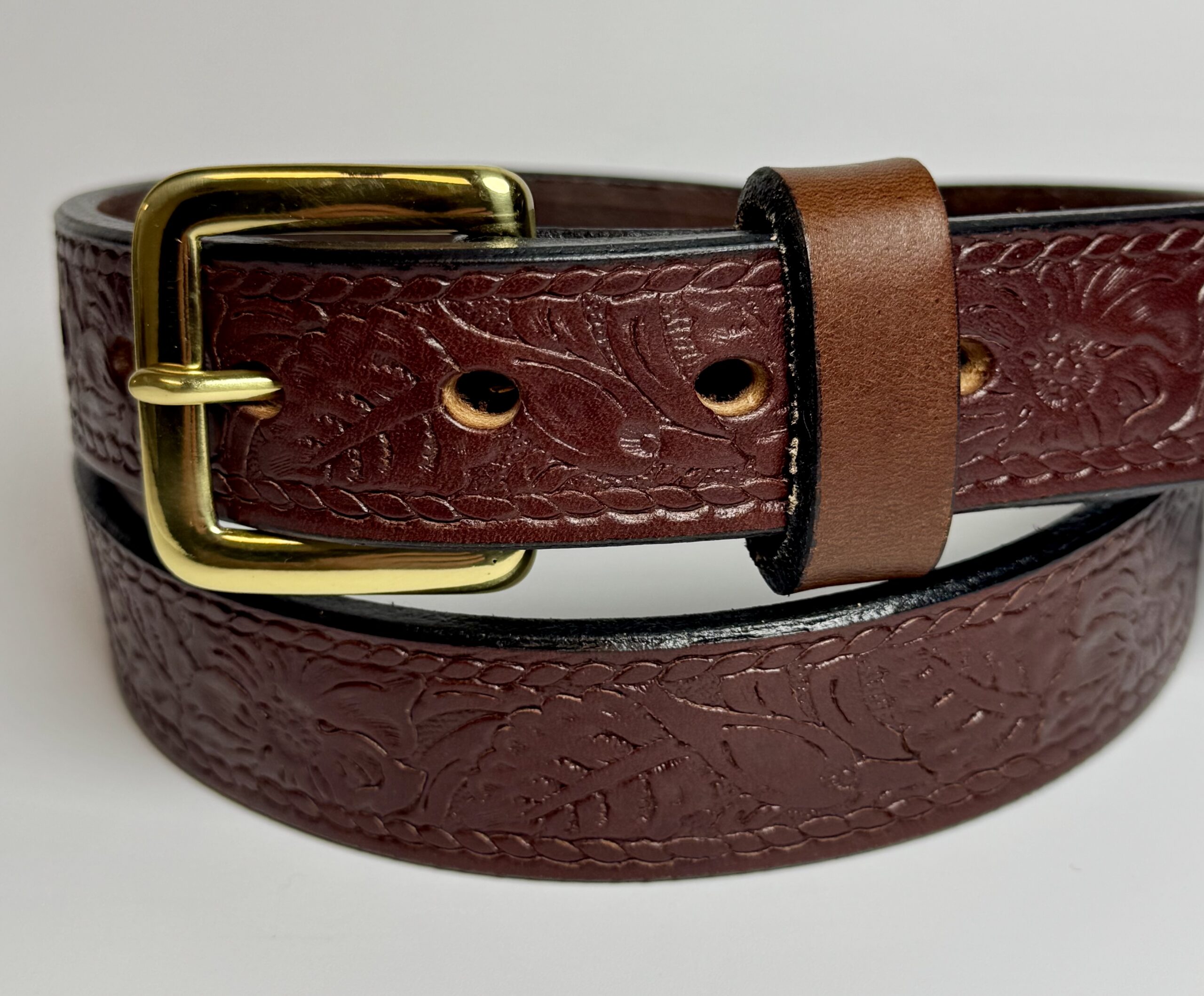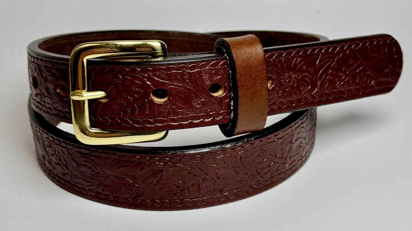 From the beginning, our Amish leatherworkers cut, tool, and finish each belt by hand. Their attention to detail ensures clean edges, smooth tooling, and a comfortable feel around the waist. The leather softens with use and develops a rich patina over time, enhancing the depth of the floral pattern. You feel the craftsmanship every time you buckle it.