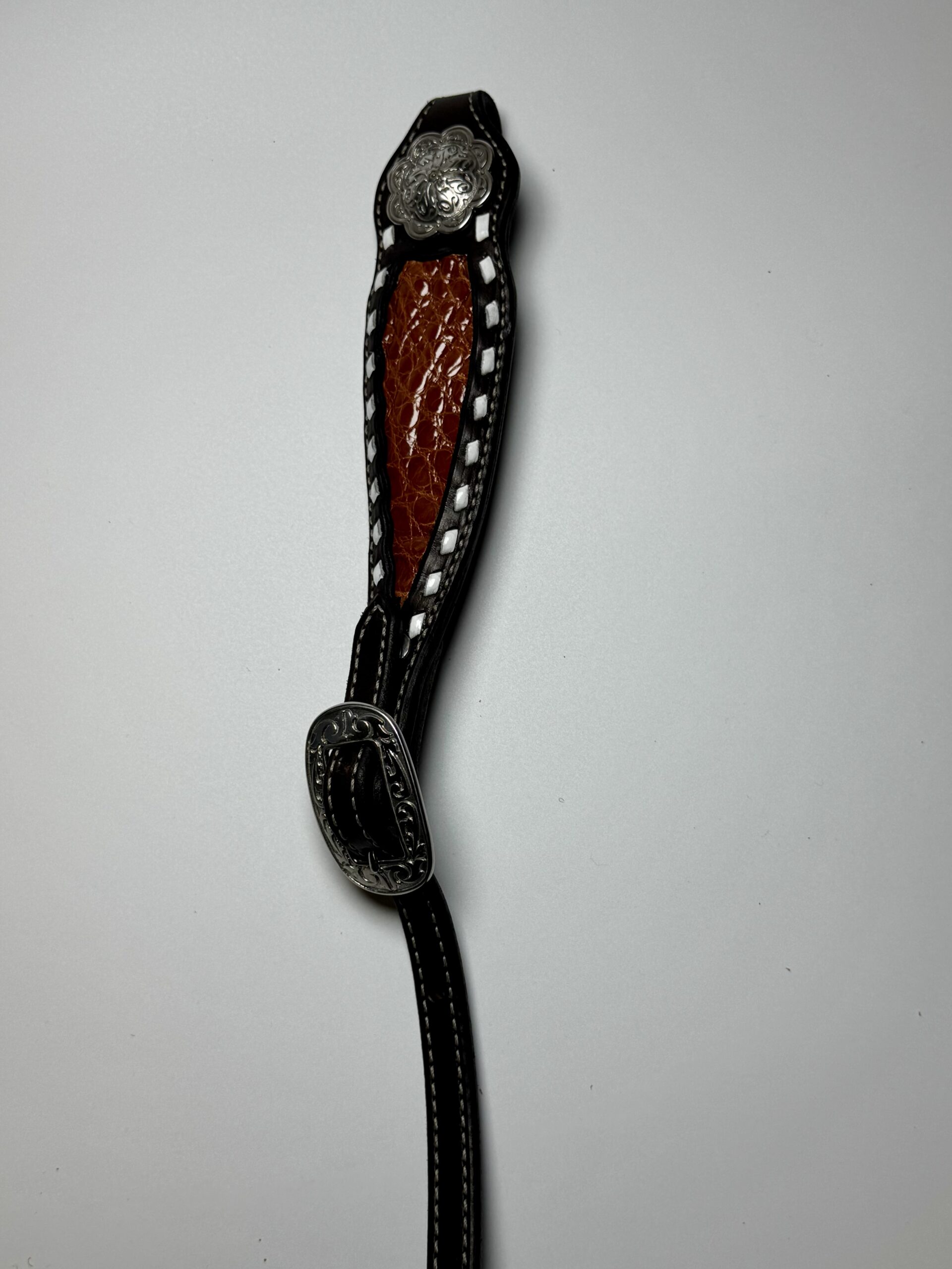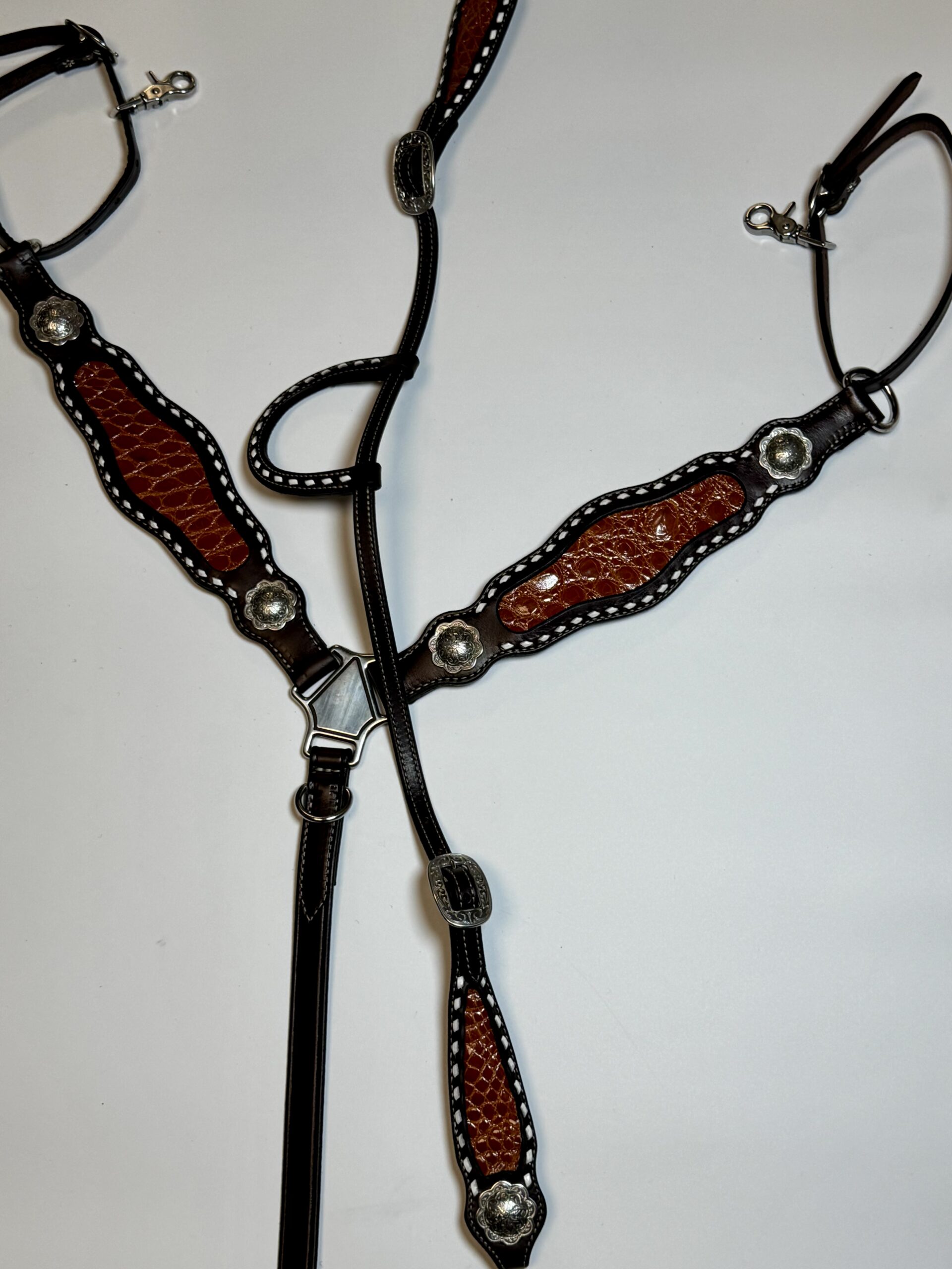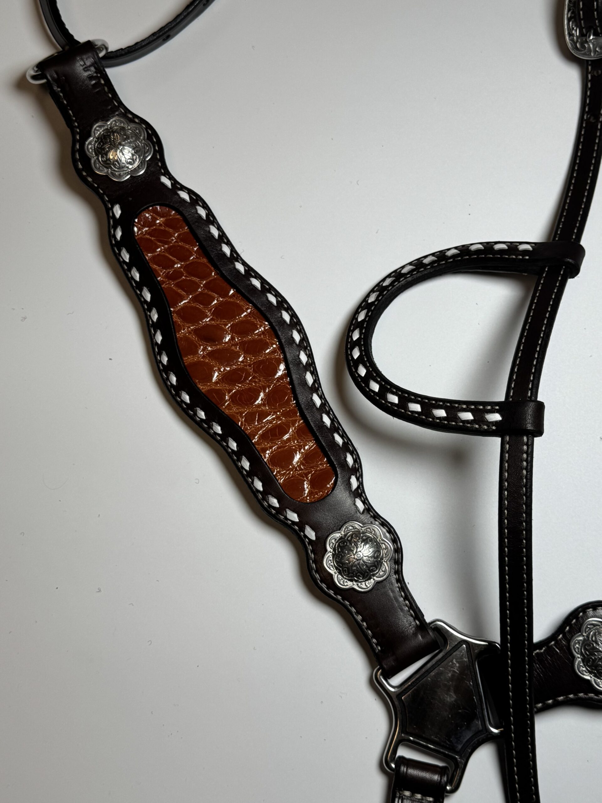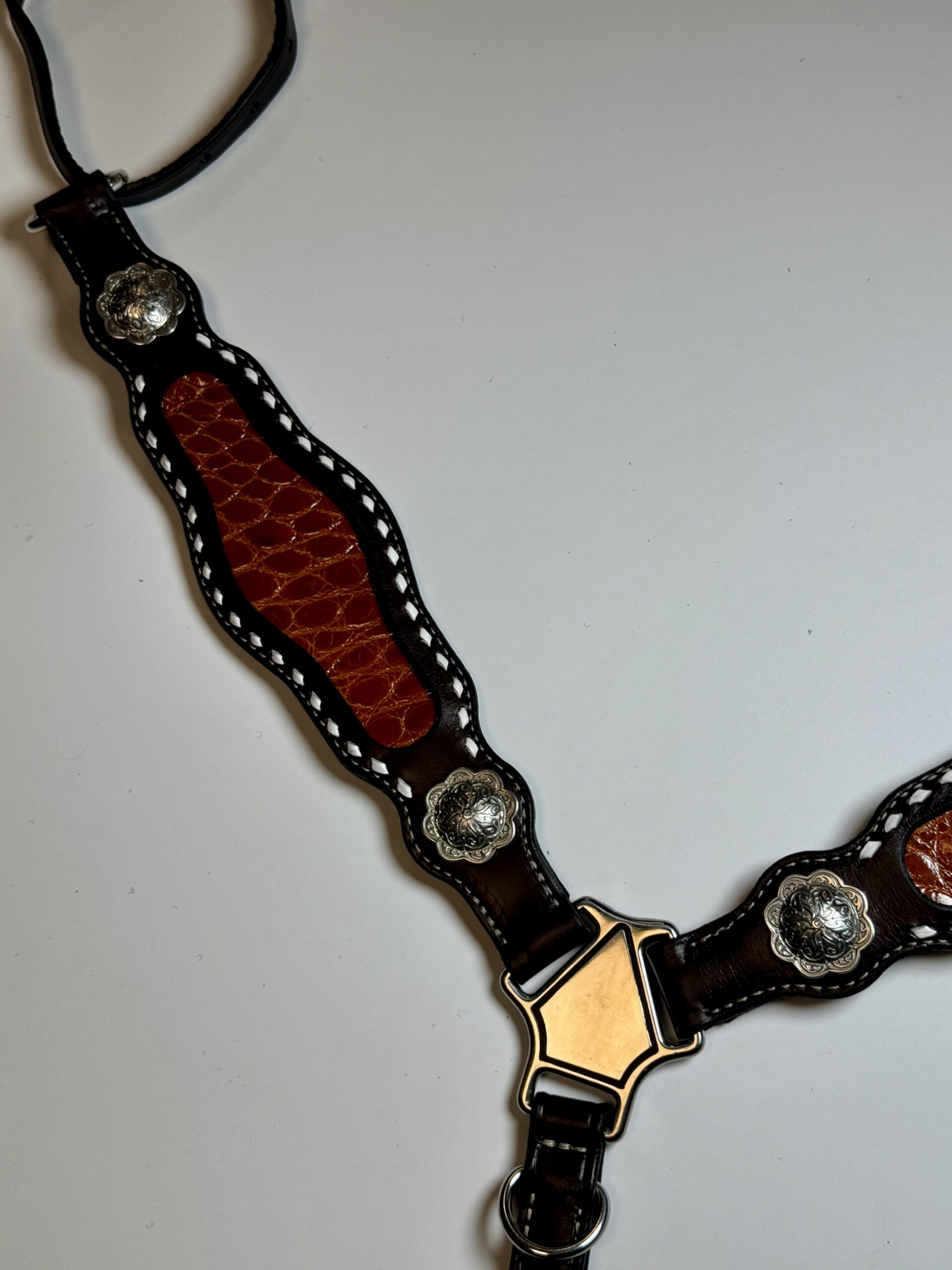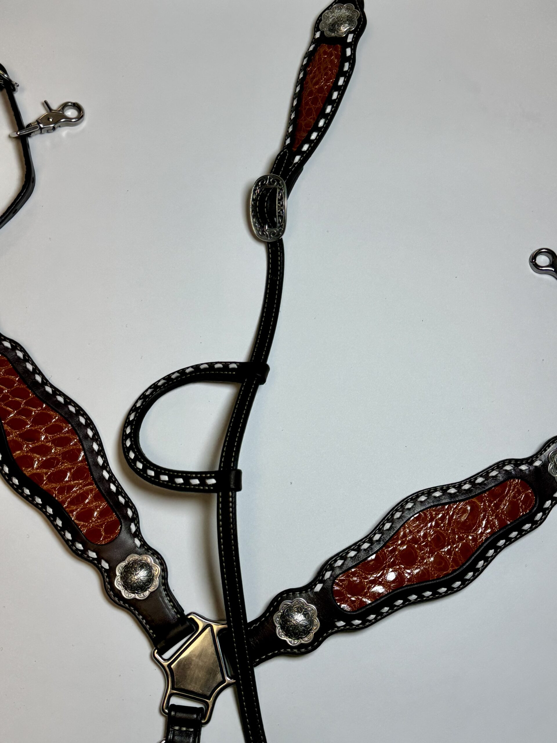 Built for durability as well as appearance, this Cognac Genuine Gator Leather Breast Collar & Headstall Set is constructed using premium leather designed to withstand regular use. The engraved western conchos and polished hardware add refined detailing while maintaining the strength serious riders expect.