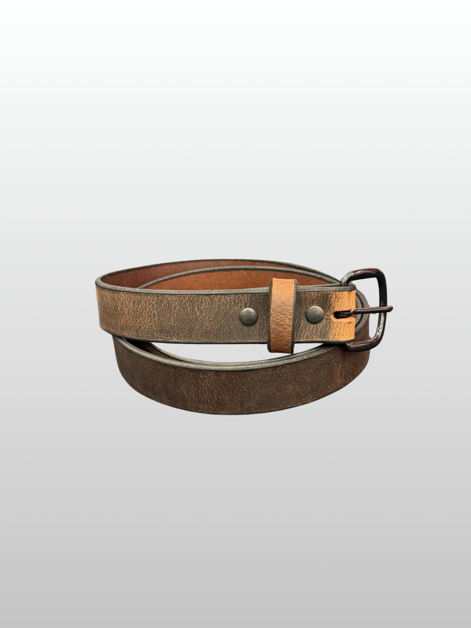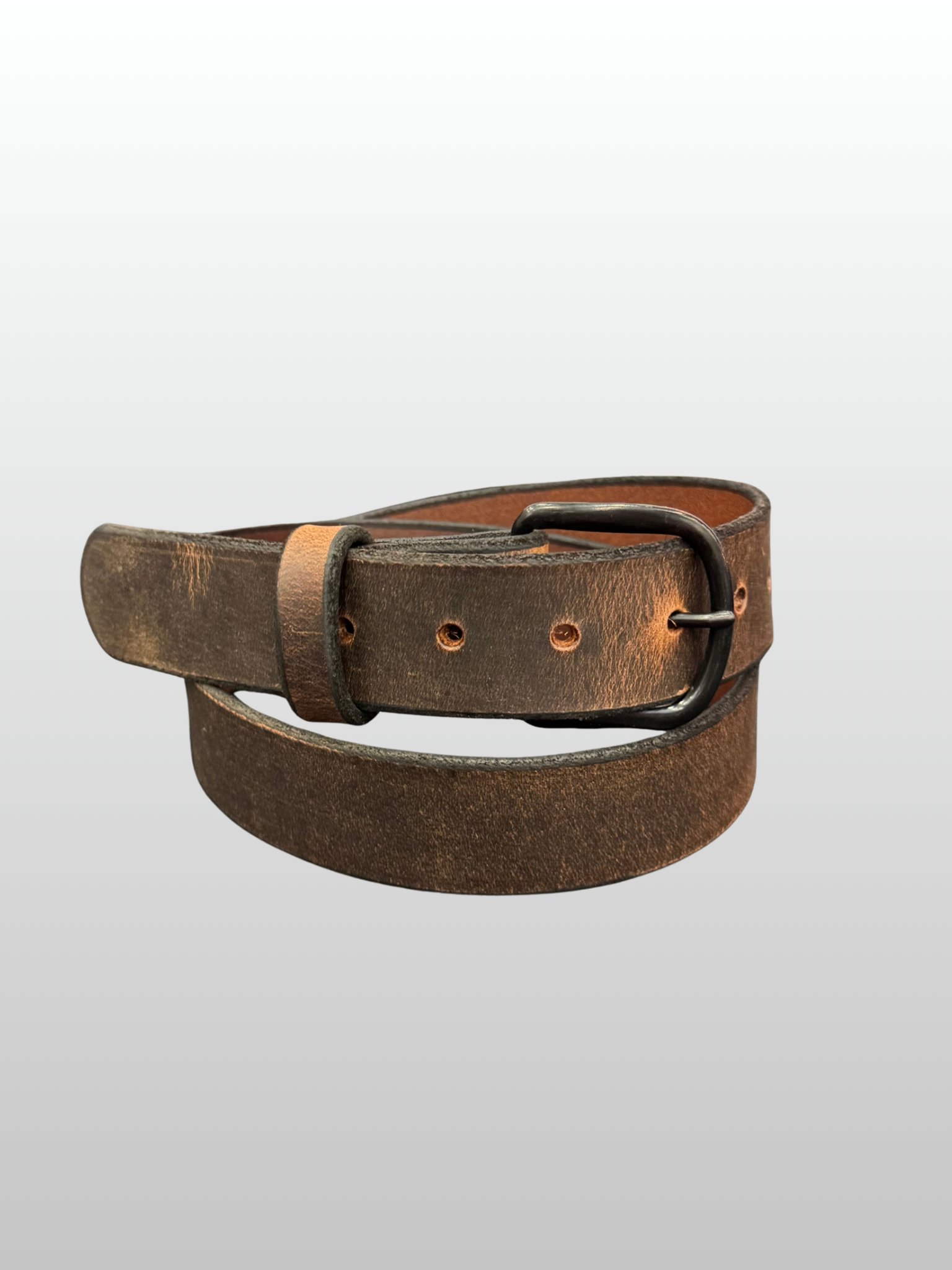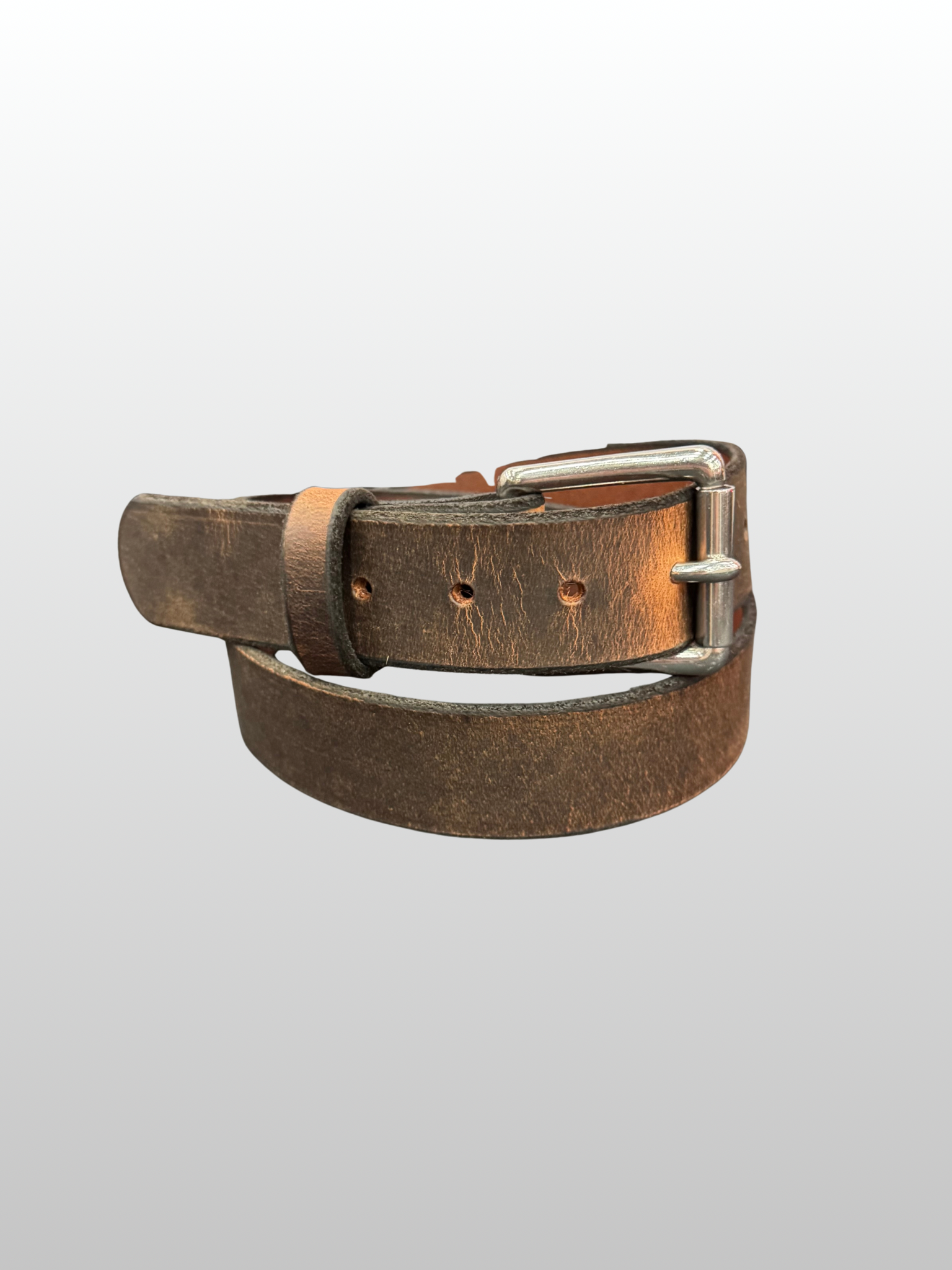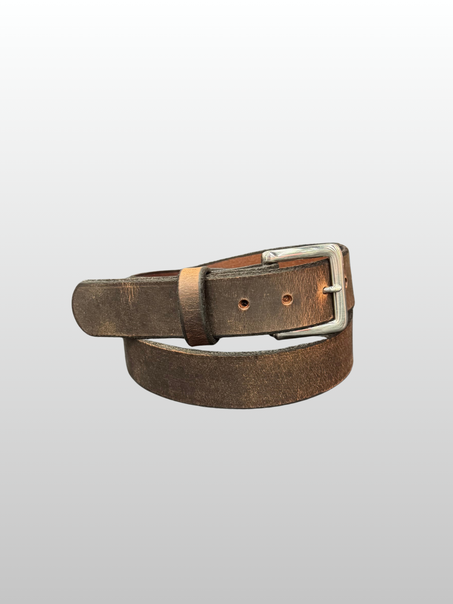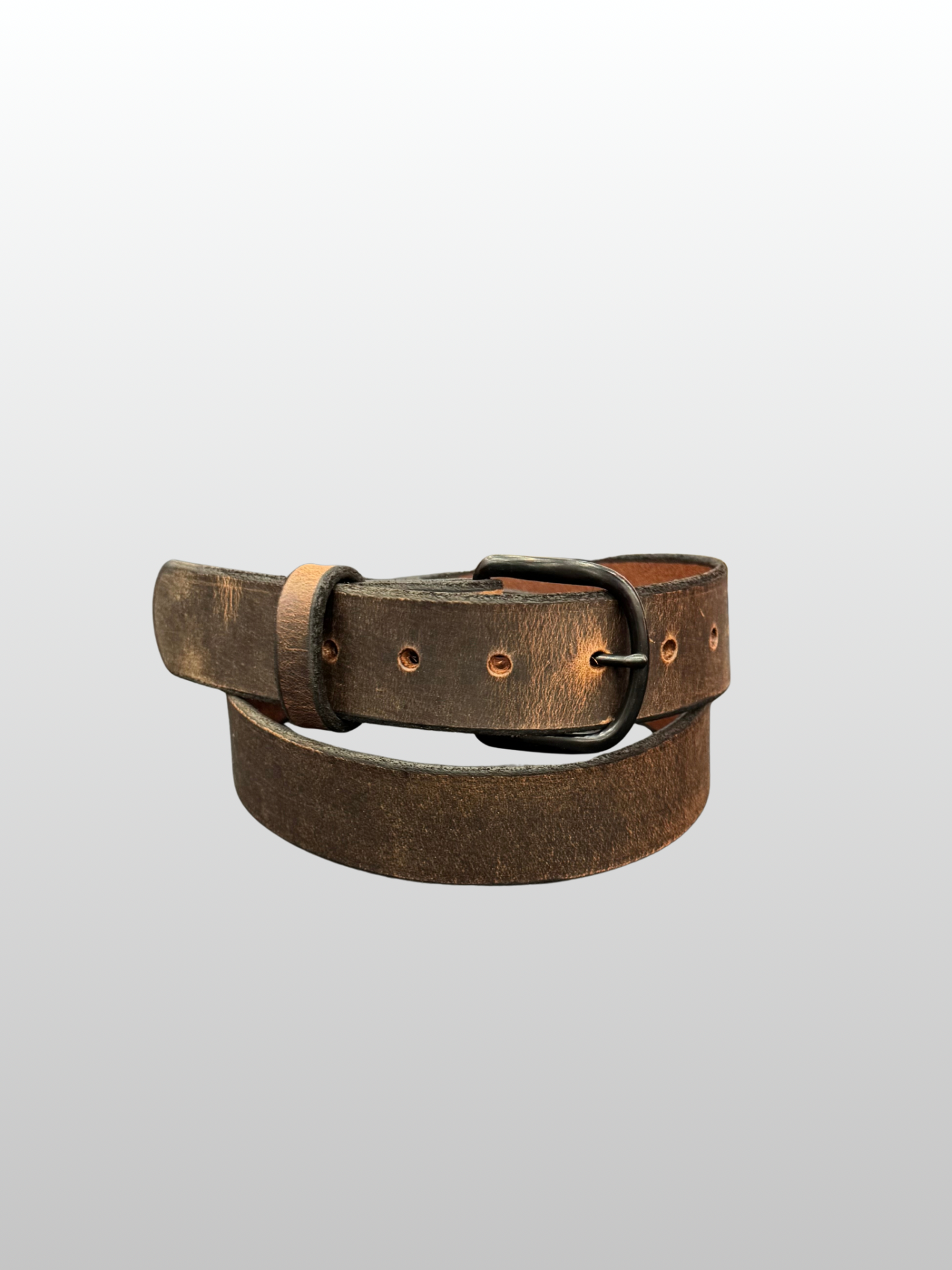 Crazy Horse leather is prized for its strength and natural weathered look. The oils within the hide rise and shift as the belt bends and flexes, creating lighter undertones that highlight the grain. This gives the Standard Crazy Horse Leather Belt a timeless, lived‑in appearance from day one. One that only becomes more striking over time.