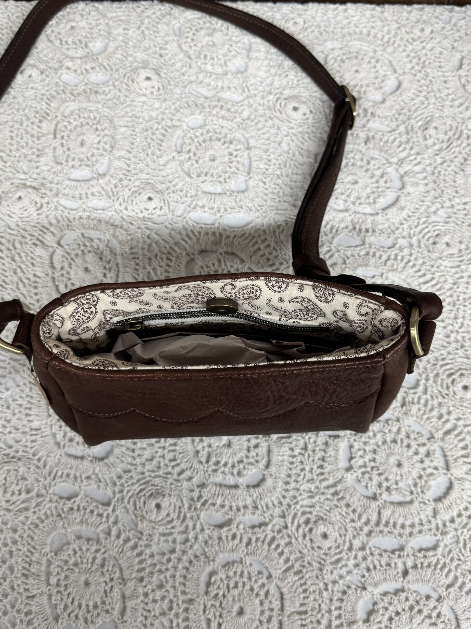 Furthermore, the dark chocolate leather pairs well with both casual and dressy outfits. Whether you’re heading to brunch, running errands, or going out for the evening, this purse complements any look with understated charm.