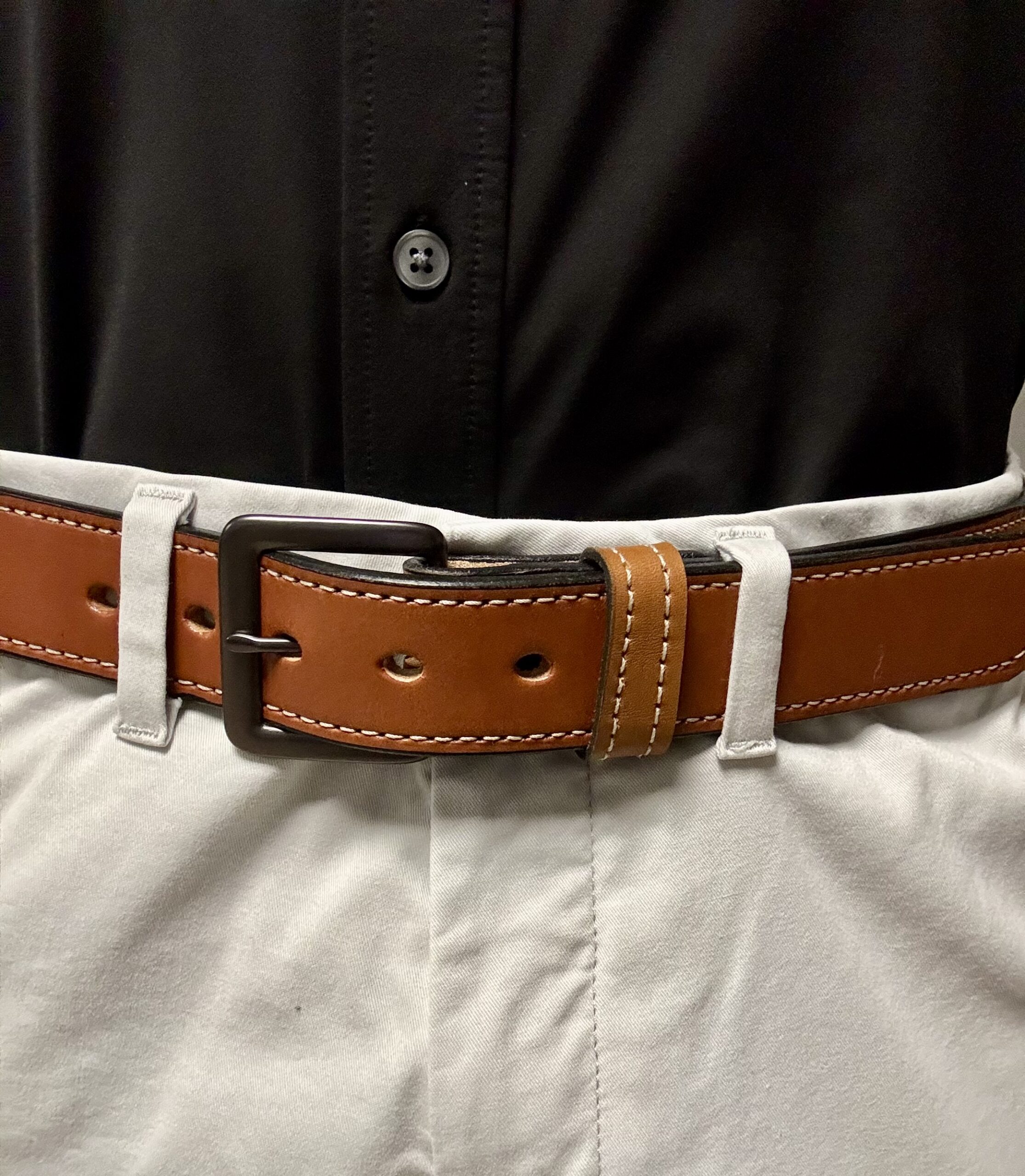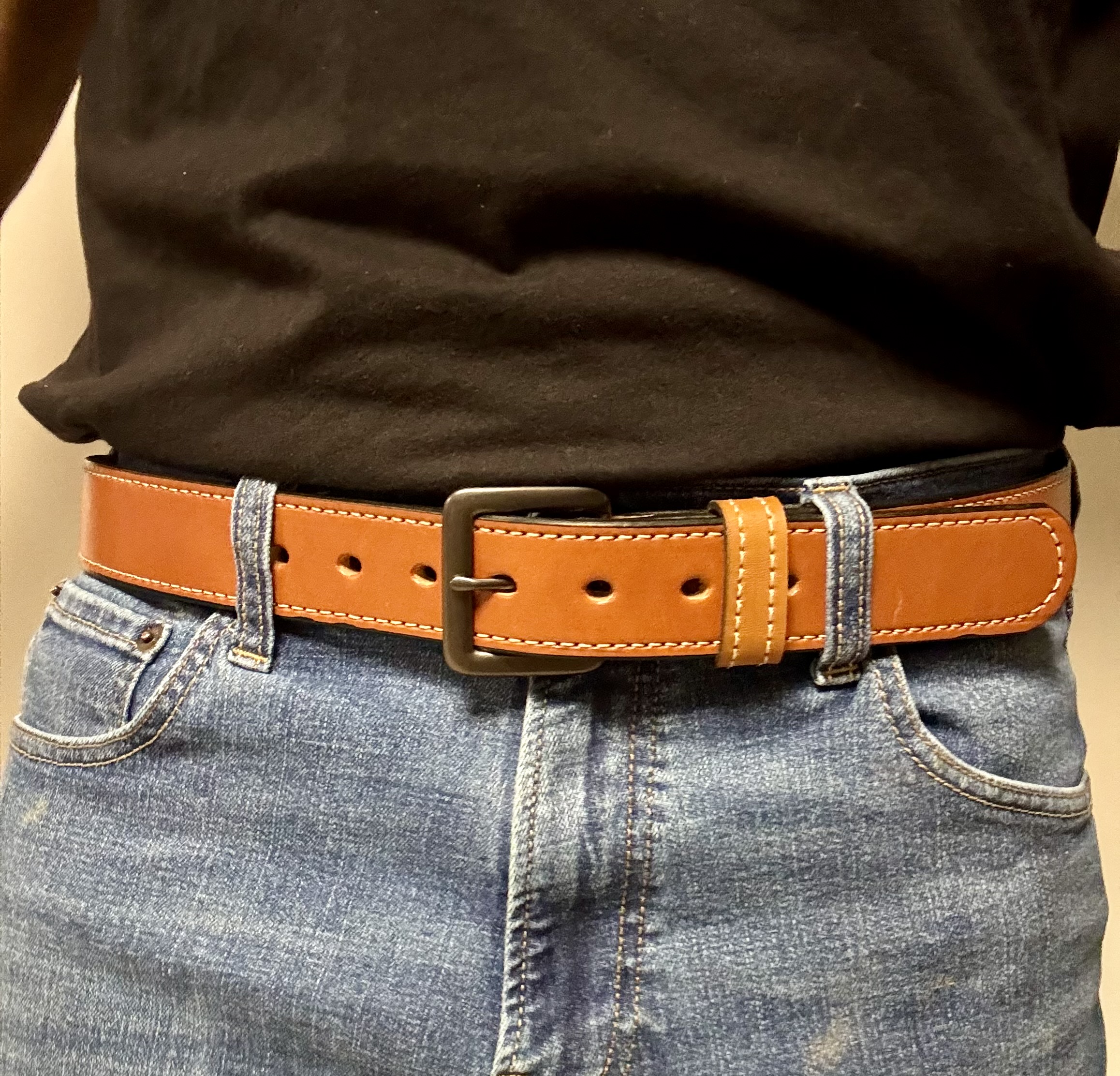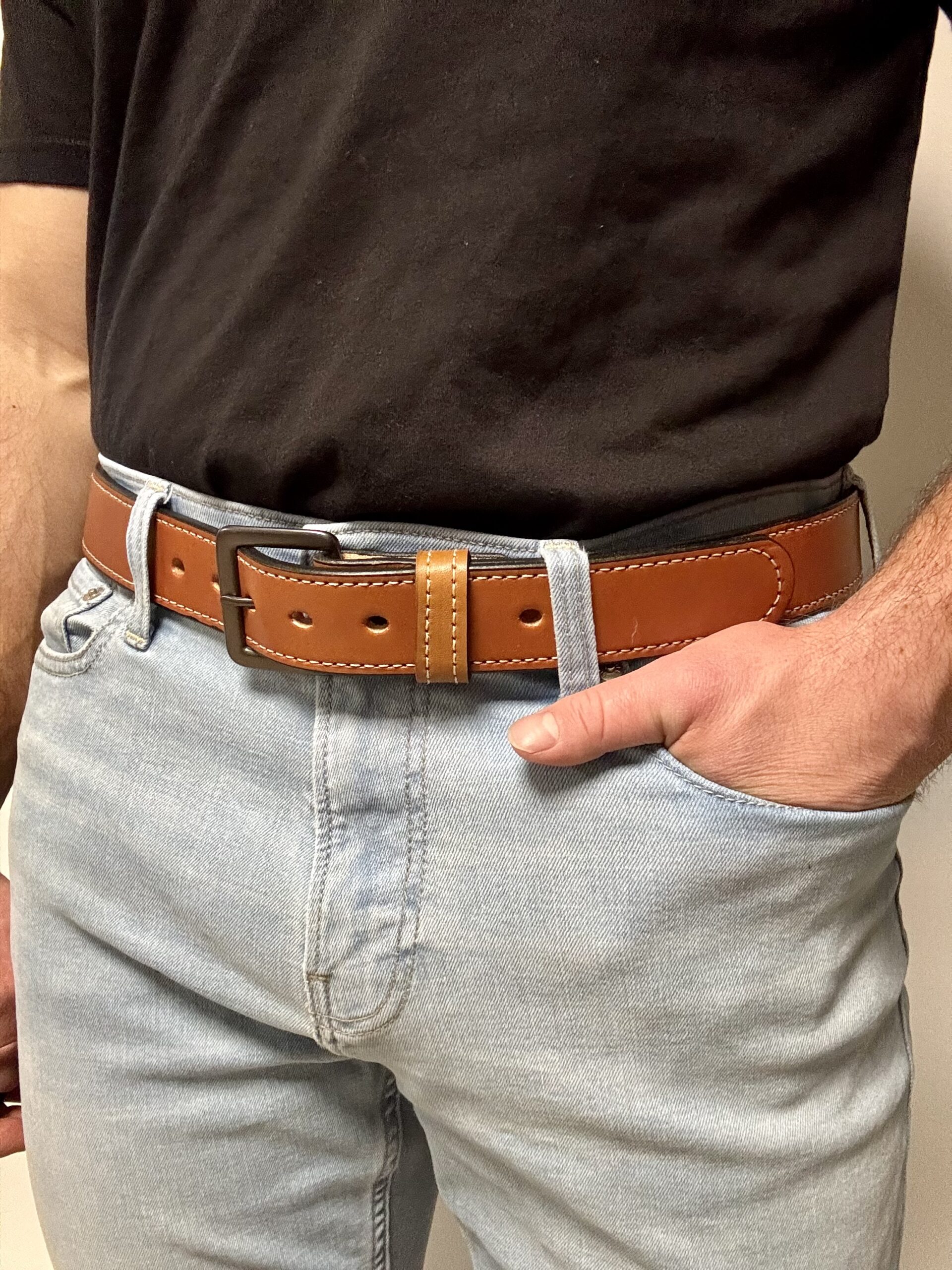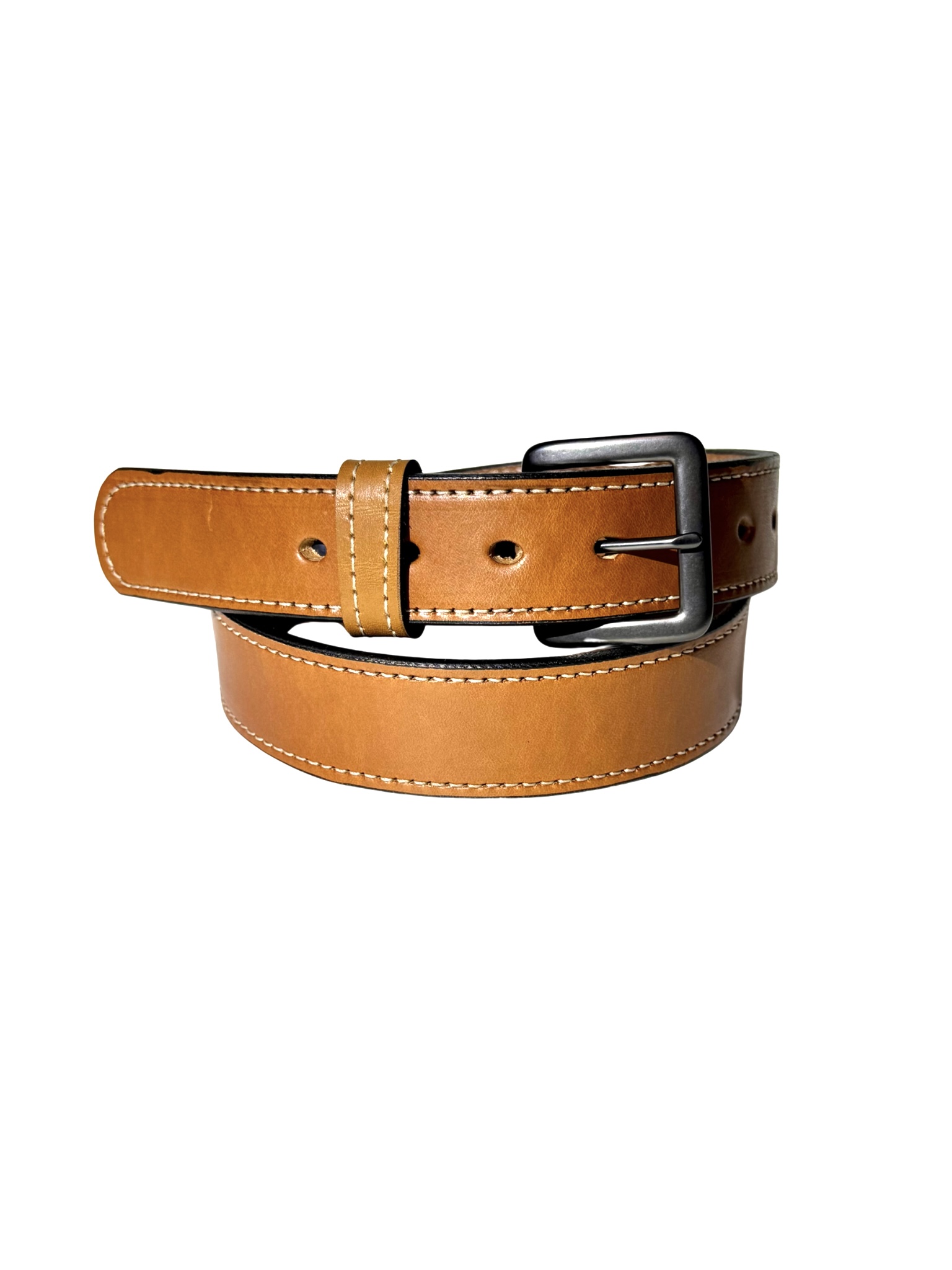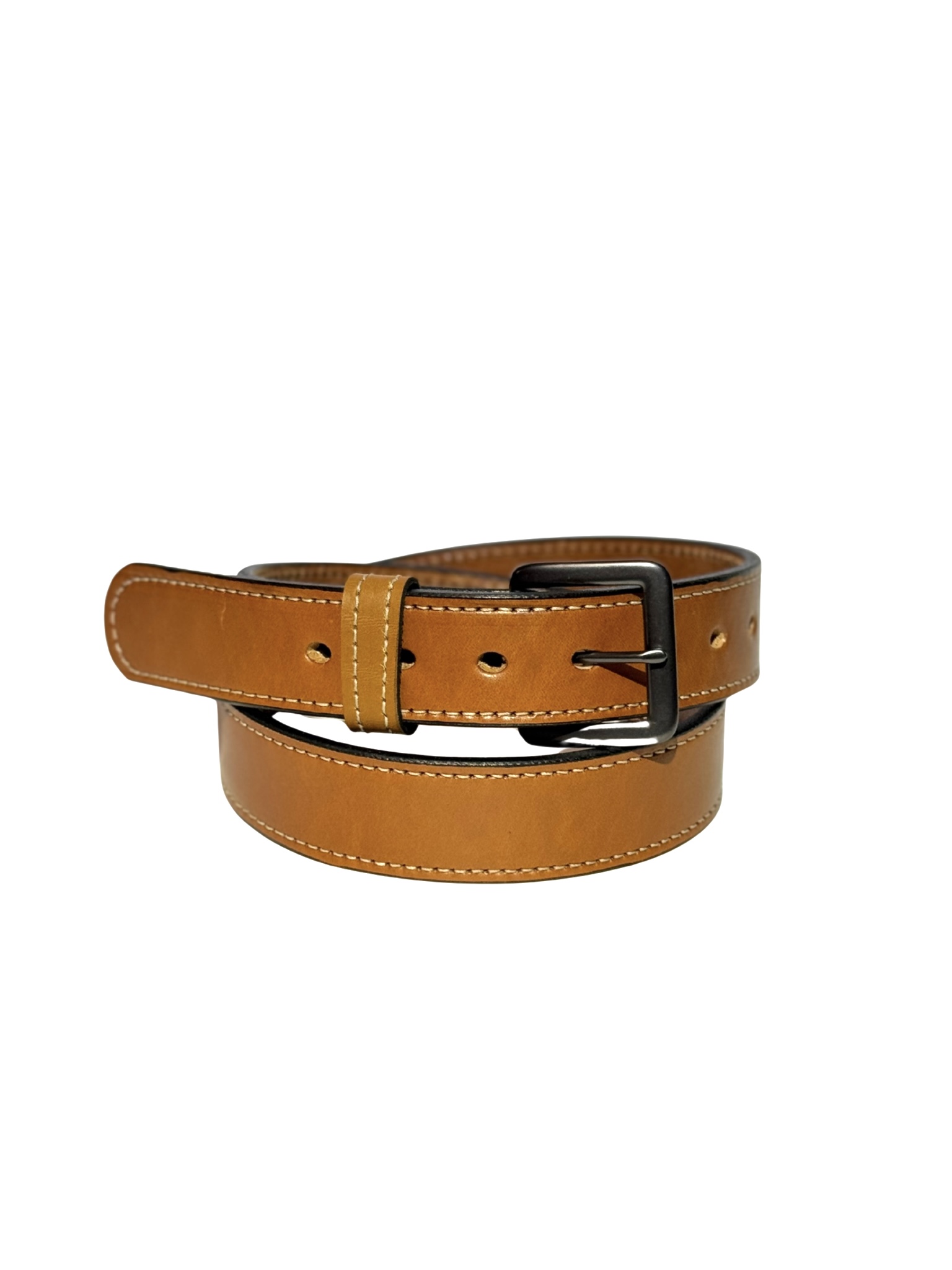 We use full‑grain leather because it lasts. It stays strong through daily wear and grows softer over time. The light brown color pairs well with jeans, work pants, or dress clothes. You can wear it to the office, the jobsite, or a night out. The white stitching adds contrast and reinforces the edges. The black metal buckle locks in place and adjusts easily.