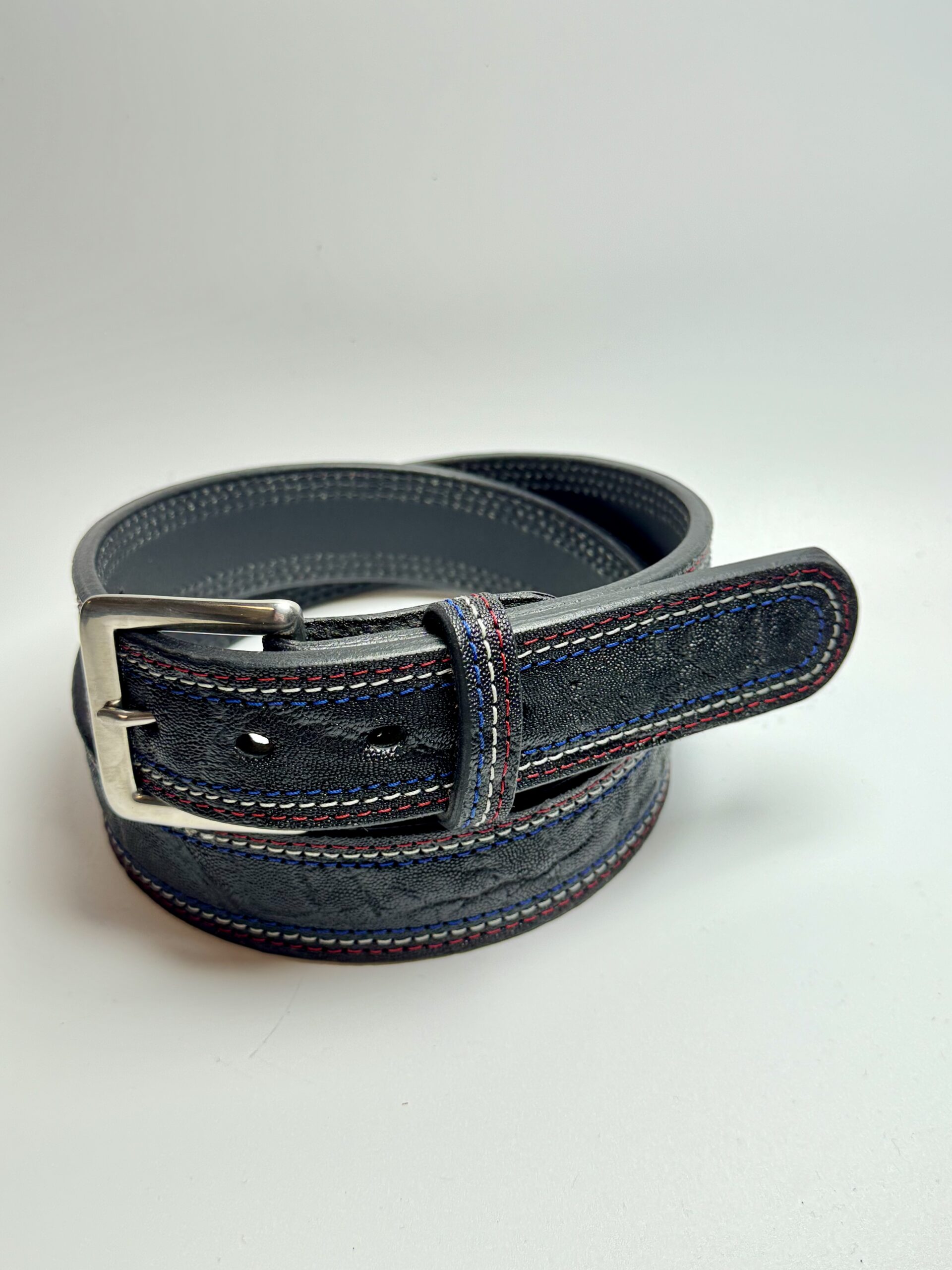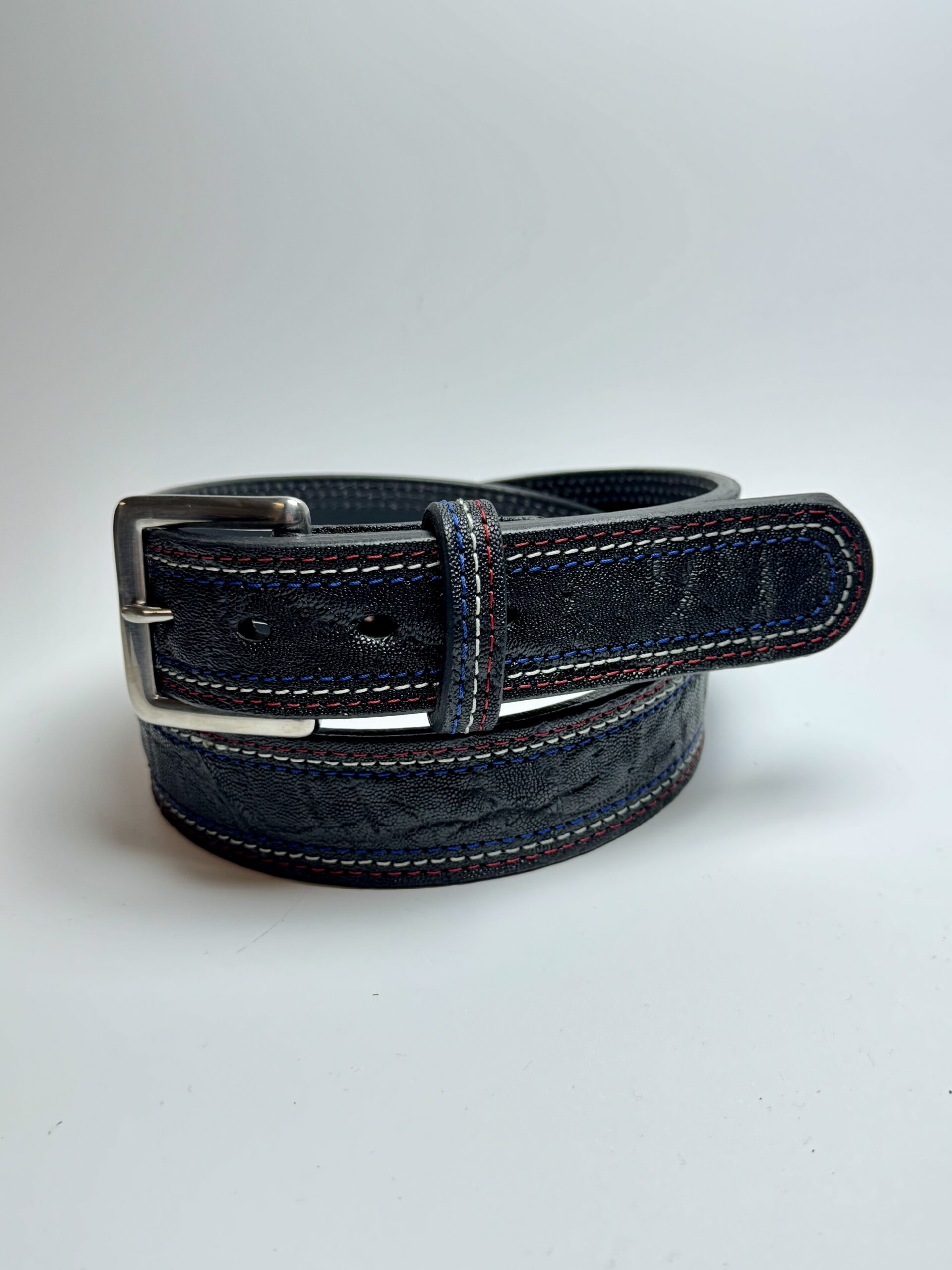 The Patriot elephant leather belt offers strength and bold style. Skilled craftsmen handcraft this belt using genuine elephant leather. The black leather creates a clean base. The red, white, and blue stitching adds a patriotic touch.