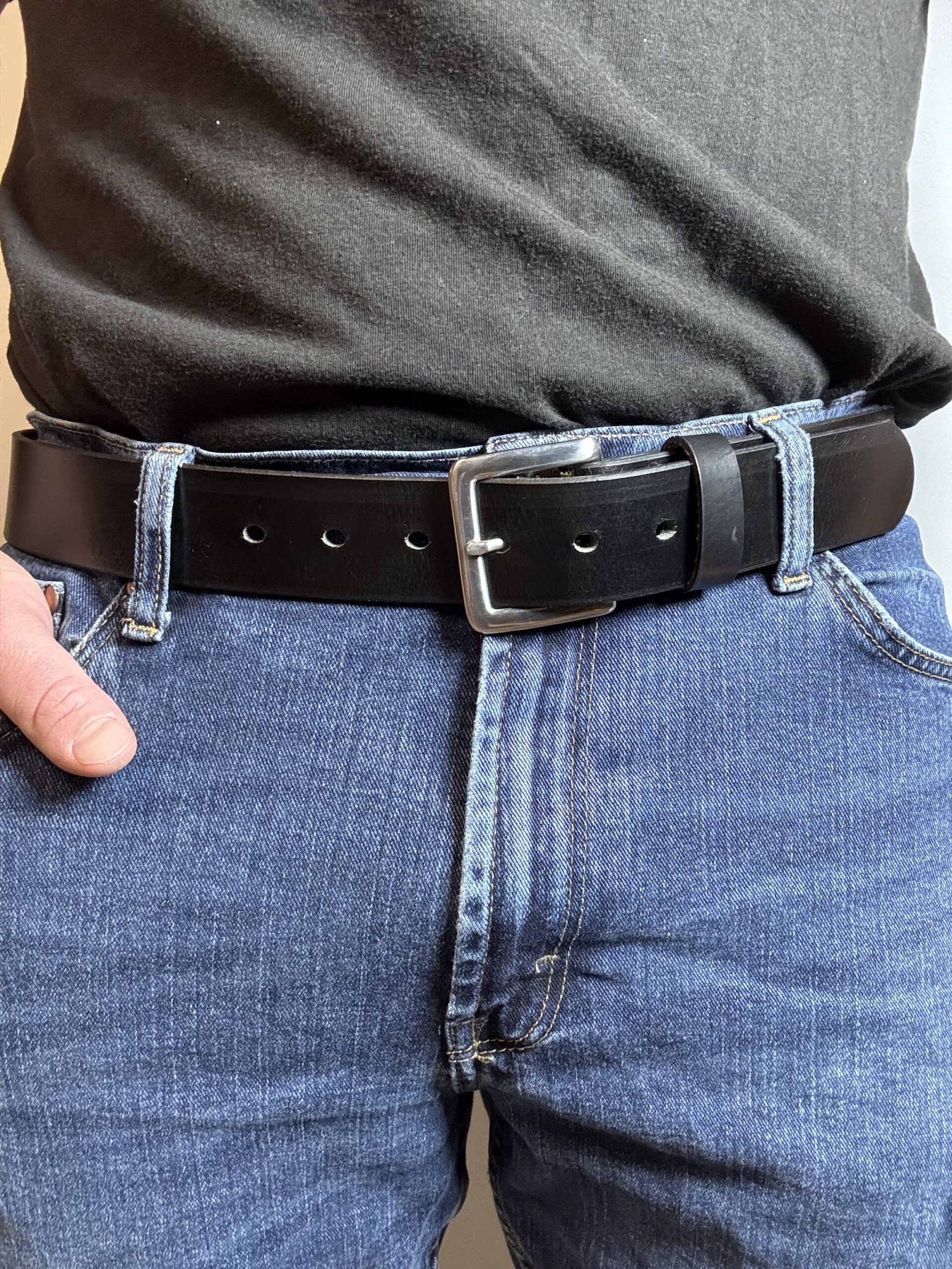 The Standard Black Leather Belt delivers clean style, dependable strength, and a timeless look that works for any occasion. Amish craftsmen cut and finish each belt by hand, and as a result, every piece reflects true care and precision. The deep black tone pairs well with jeans, khakis, and dress pants, making it one of the most versatile belts in your wardrobe.