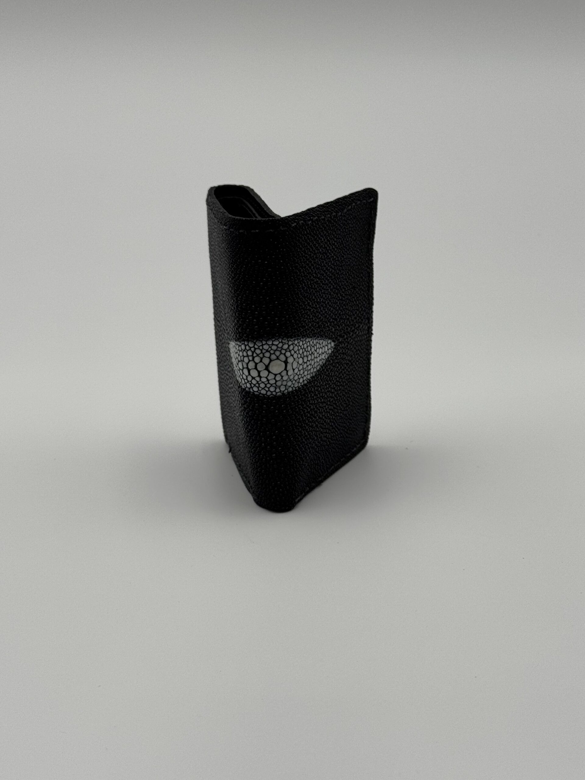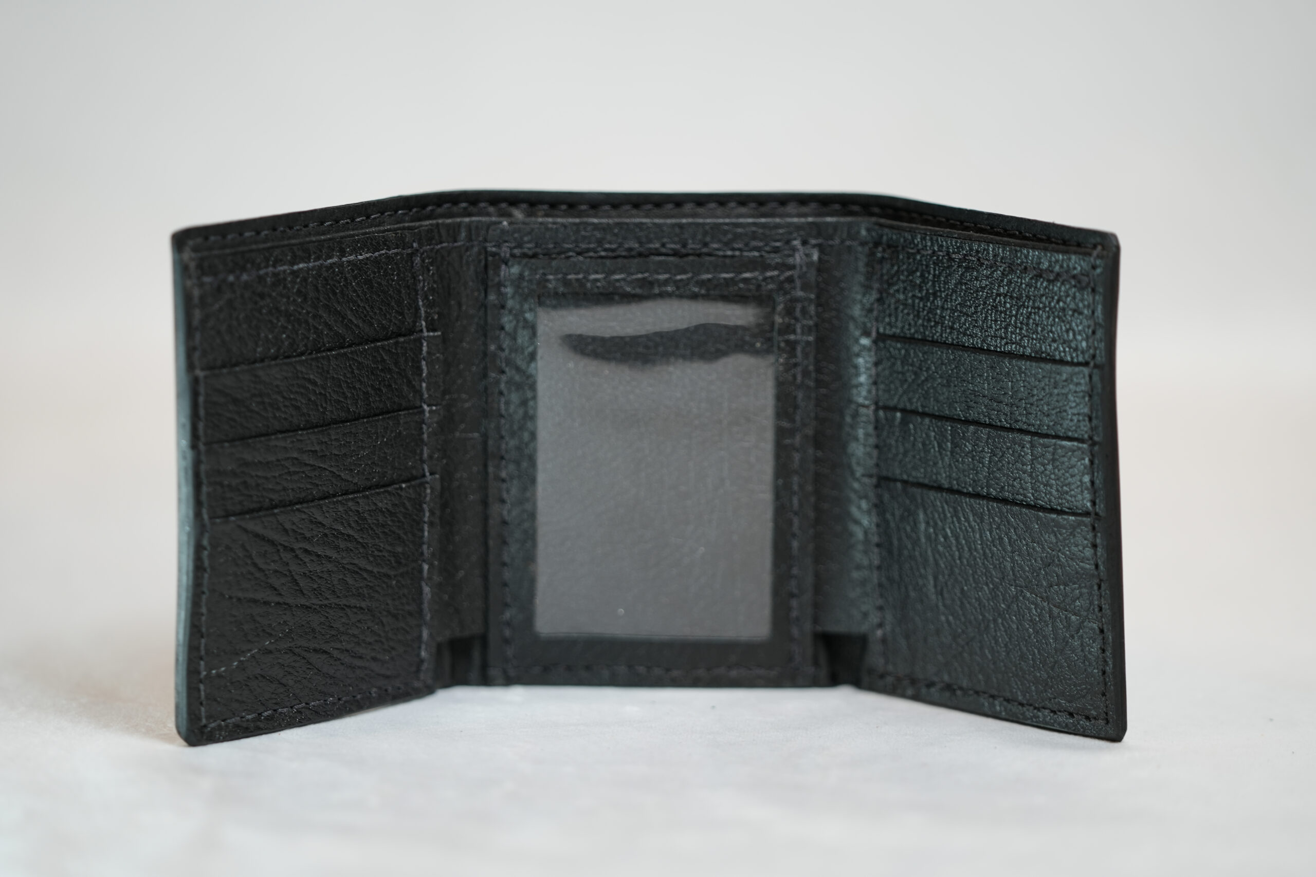 This Amish-made trifold wallet is a fusion of old-world craftsmanship and modern sophistication. The black stingray skin exterior offers a bold, tactile finish that’s both durable and eye-catching. Measuring roughly 3.25″ x 4.25″, it’s designed for everyday use with a touch of the extraordinary.